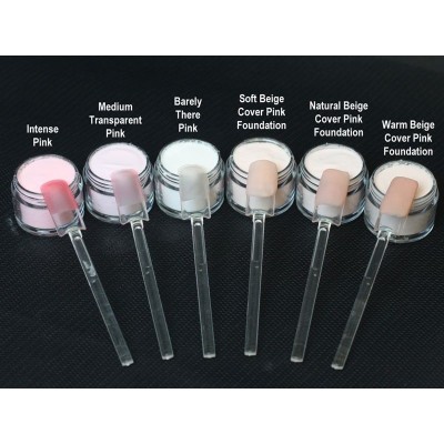 Colección de 6 polvos acrílicos en tonos piel (nude y beige) diseñados para maquillar la almendra y el lecho ungueal. Ideal para alargar, cubrir imperfecciones y crear bases naturales impecables, adaptándose a diversos tonos de piel.