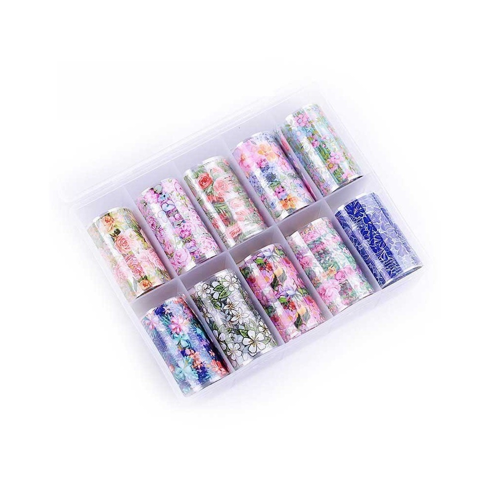 Caja con 10 rollos de papel foil, cada uno de 1 metro de largo, para crear efectos metálicos y decorativos en tus uñas. Ideal para diseños de nail art con transferencia de color, aportando un acabado brillante y moderno a tus manicuras de gel o acrílico.